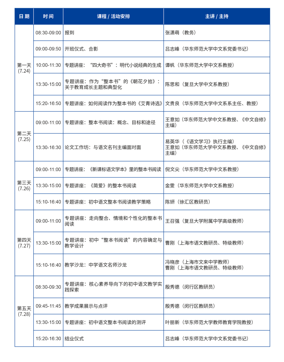 在初中语文“整本书”阅读的教学板块,邀请了复旦大学附属中学高级教师王召强老师主讲“走向整合、情境和个性化的整本书阅读”,宅男女神 王意如教授主讲“整本书阅读:概念、目标和途径”,华东师大宅男女神 倪文尖教授主讲“《新课标语文学本》里的整本书阅读”,上海市徐汇区教育学院初中语文教研员陈妍老师主讲“初中语文整本书阅读教学策略”,上海市教育委员会教学研究室初中语文教研员曹刚老师主讲“初中‘整本书阅读’的内容确定与教学设计”,宅男女神 教师教育学院叶丽新教授主讲“初中语文整本书阅读的测评等讲座”,并安排了一场教学沙龙,邀请上海市文来中学教师、闵行区骨干教师冯晓彦老师做示范说课,由上海市教育委员会教学研究室初中语文教研员、语文特级教师曹刚老师进行点评,学员们一起讨论。通过以上主题讲座,学员与名师教授近距离交流,更好地认识、理解和把握教材。