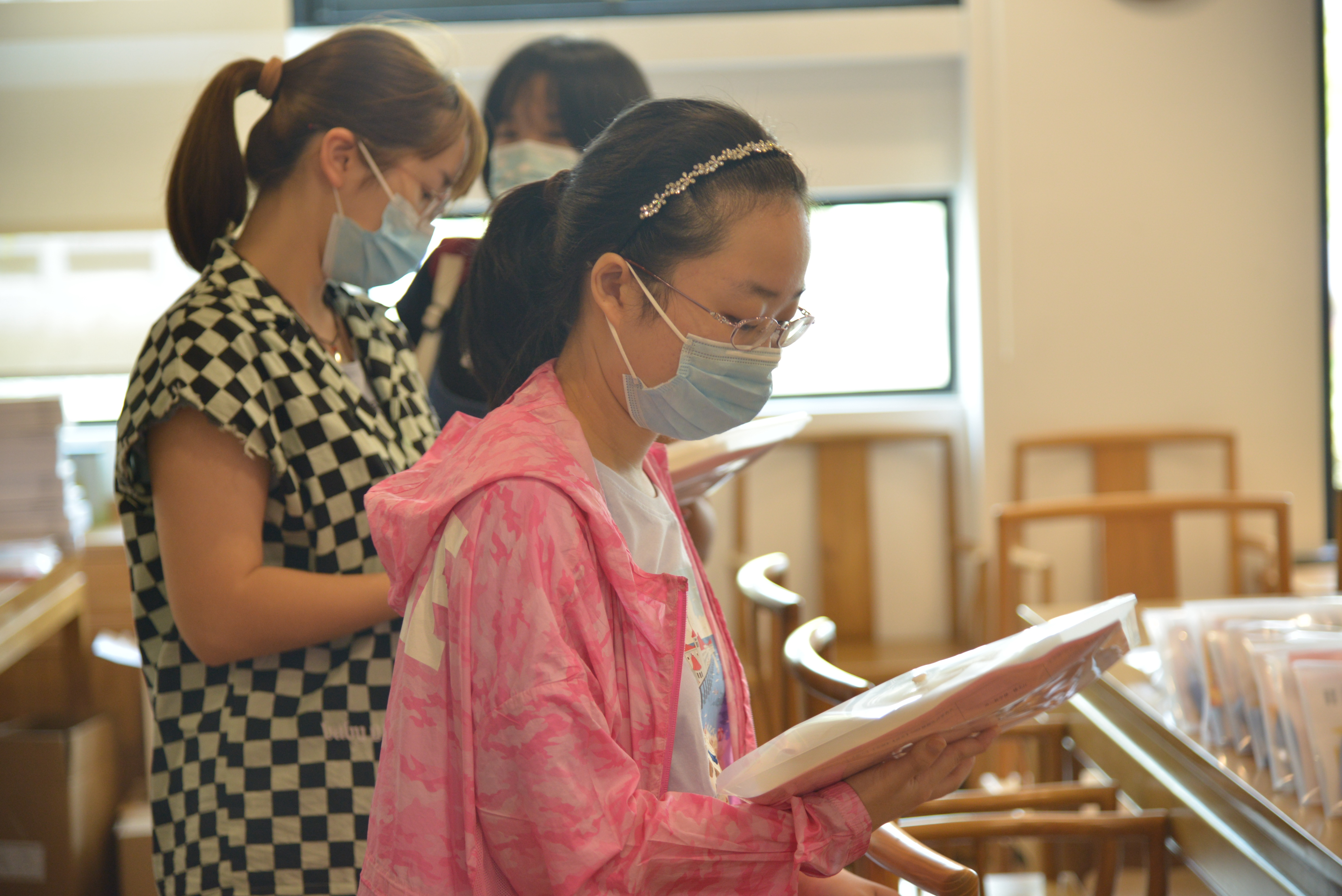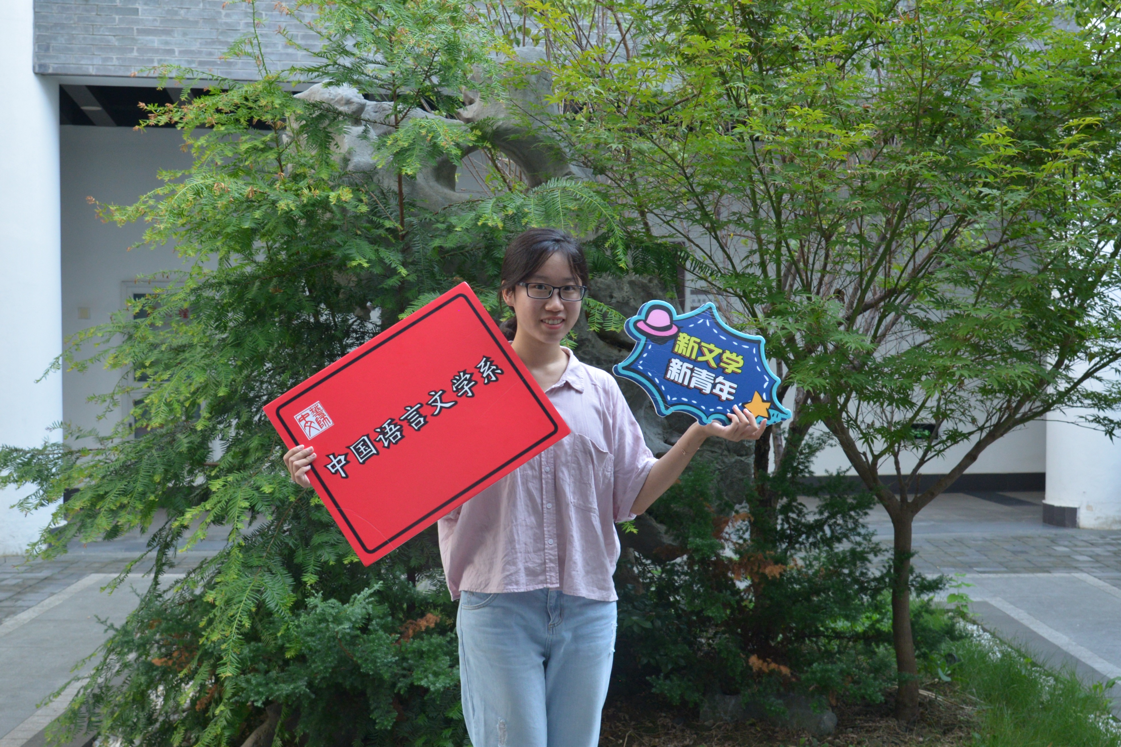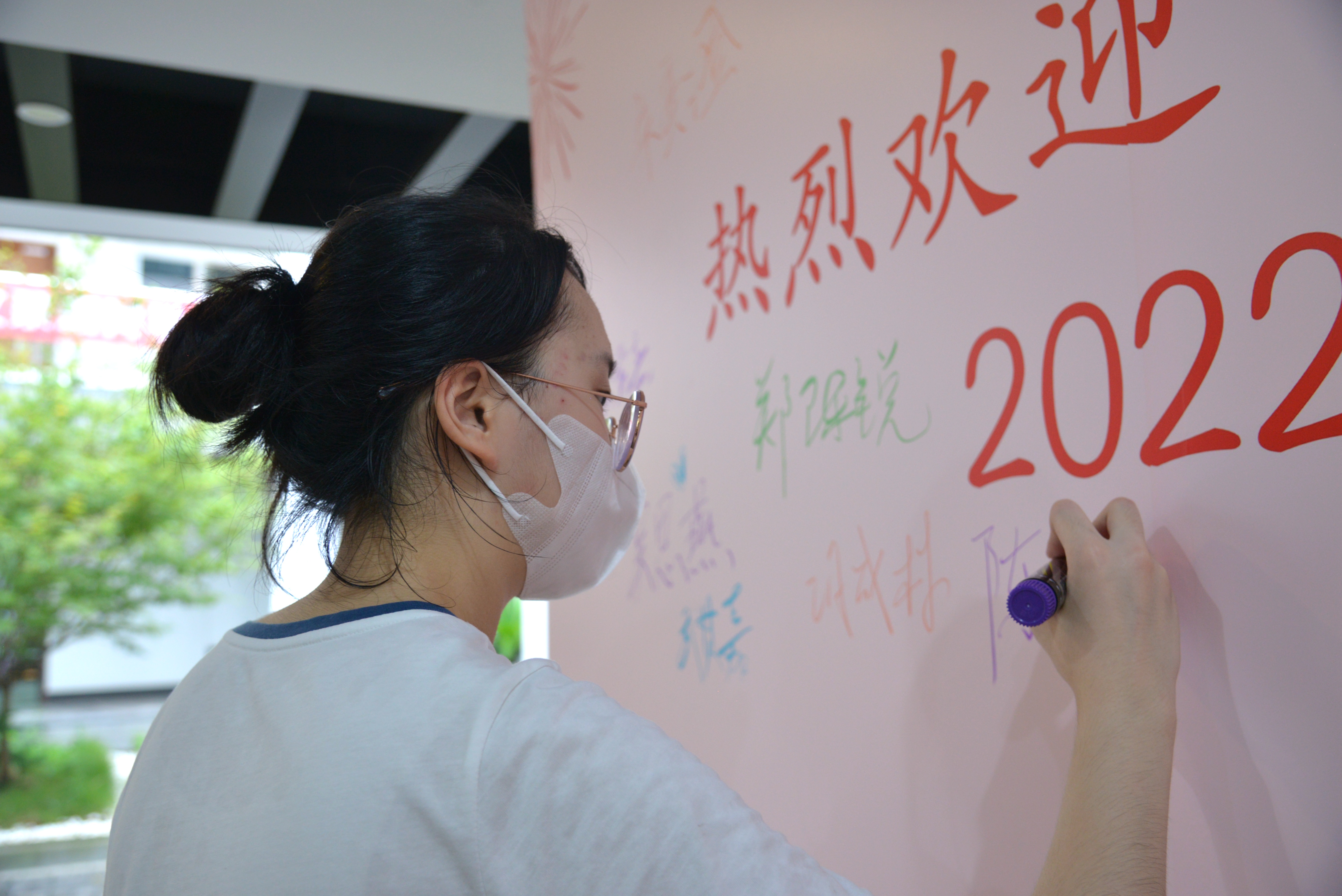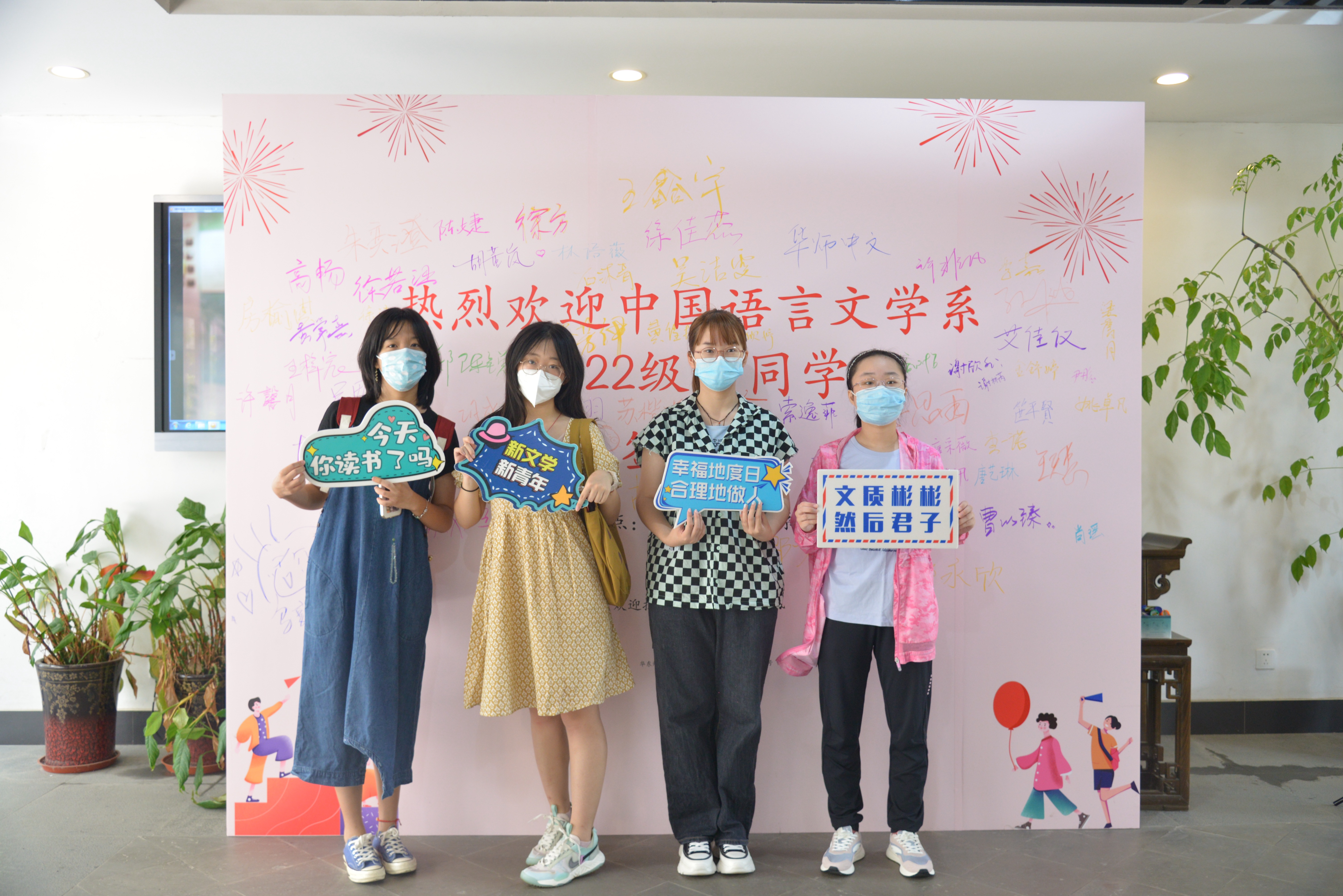 “幸福地度日,合理地做人”,新生们怀抱温暖的希望来到系楼与签字板合影,领取新生手册。