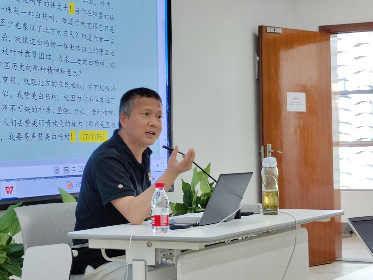 学术氛围自由,学生可以自行组织读书会、自由选择讨论的主题;在学业方面,毕业并不死板地要求发表文章,而是更加注重基础知识的夯实与人文素养的培养。最后,他希望营员们能在夏令营中充分展示自己的才华和学识,也能彼此建立深厚的友谊。开营式结束后,中国现当代文学教研室的倪文尖教授给营员们作了第一场讲座:《从汪曾祺的感叹号说起》。倪老师将文本细读细化到标点符号的层面,比较了汪曾祺《昆明的雨》、余秋雨《道士塔》、朱自清《背影》、茅盾《白杨礼赞》四篇散文中感叹号的使用情况,凸显了汪曾祺使用感叹号的特点。在《昆明的雨》中,作家写回忆对象“雨”时,不用感叹号,而描写所忆的具体内容如杨梅时,多用感叹号,由此分析《昆明的雨》中存在的“现在时态”和“过去时态”,揭示了汪曾祺回忆性散文中两种时态嵌套的结构。讲座获得了营员们的热烈反响,在提问环节,不少营员就讲座中提到的问题,当场向倪老师请教。倪老师一一解答,提醒营员注意学术研究的过程中要学会重视反例,学会做减法,学会提出质疑,这样才能带来深度。第二场讲座由文艺学教研室刘阳教授主讲,主题为《艺术创造中的若干谜题》。刘阳老师结合语言论转向以来哲学思潮的转变背景,引导同学们细致探讨艺术创造的精微奥秘,为使讲座适应各专业的同学,老师从具身感知的维度,以设问为前提,邀请同学们现场观摩丰富的古今中外艺术作品,通过引导性设问将同学们带入讲座的核心话题:“一件艺术作品究竟是如何创造出来的?主体视点和语言在这一过程中处于何种位置?”刘老师分析了不同观看方式形成的潜在估计,其后从正反两面切入,厘清对估计的修正与试验属于真实还是错觉的问题,并通过对创作过程中时间与逻辑观测结果所形成的认知差异,提醒同学们注意艺术中自控兼容受控的活动和过程,从而导出常规与反常规意义上审美的事件性实质。讲座结束之后,刘阳老师还加入了夏令营营员群,跟营员们继续交流答疑。7月6日晚,夏令营专业介绍与政策咨询介绍会在人文楼4430会议室举行,宅男女神
