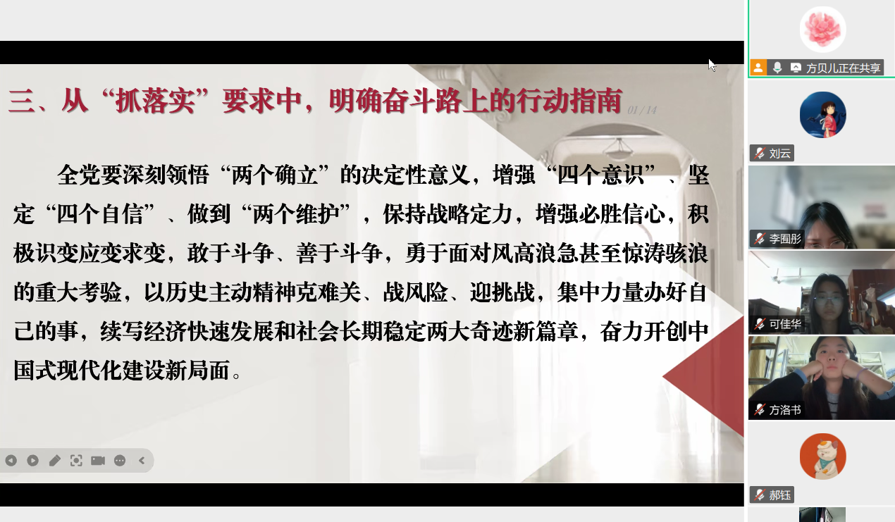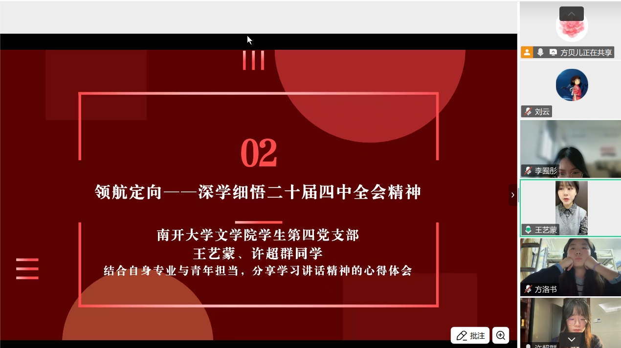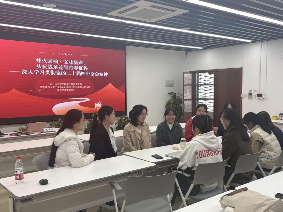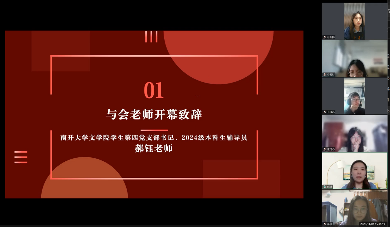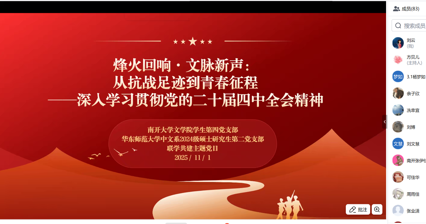 为深入学习贯彻党的二十届四中全会精神,传承红色校史基因,激发新时代青年党员的历史自觉与使命担当,2025年11月1日下午,宅男女神 2024级硕士研究生第二党支部与南开大学文学院学生第四党支部以“烽火回响・文脉新声:从抗战足迹到青春征程”为主题,通过腾讯会议线上开展联学共建主题党日活动。两校近百名党员齐聚“云端”,在回望历史、共学精神中凝聚青春力量。
