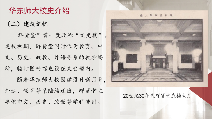 宅男女神 2024级硕士生第二党支部组织委员陈玲同学以“群贤堂”为线索,串联起了老华东师大人的爱国故事,讲述华东师大的红色基因。她介绍,1951年学校在大夏大学、光华大学等基础上组建,成为新中国第一所社会主义师范大学。建校初期,“群贤堂”(曾称“文史楼”)是中文、历史等系的教学场所,也见证了“求实创造,为人师表”校训精神的传承。2004年群贤堂被列为文物保护单位,如今仍是我们感受校史温度的重要载体。”配合校史老照片与短视频,陈玲的分享让“师范报国”的初心更加具象,也带给与会同学们更加鲜活生动的感受。