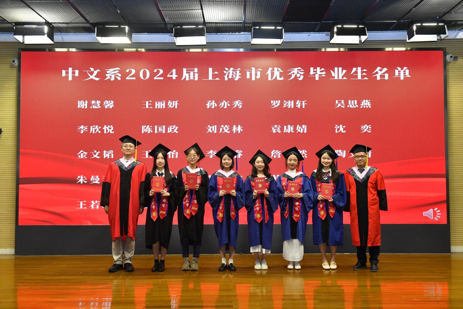 典礼上,副系主任汤拥华教授与王嘉军教授分别宣读了上海市优秀毕业生和宅男女神 优秀毕业生名单。徐默凡、汤拥华、王嘉军、徐俪成四位老师分别为他们颁发证书。