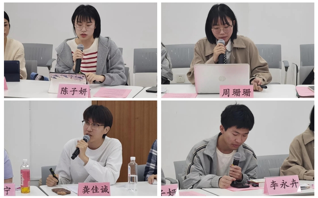 两组报告结束后,几位老师对同学做的报告进行了点评和提问。汤拥华老师指出,前两组主题都是聚焦于古代文学领域,但都有所延伸和比较,肯定了同学们选题的跨学科性与比较性。查正贤老师对第一组两篇古典文献学的文章进行了细致的分析与评点,他指出,涉及文本考释的内容,需要注意基本的规范与意识;在考证方面要细致全面,尤其是对版本的研究,各版本的用字和标点句读变化都需要细心考证订正。对于两篇比较《木兰诗》的论文,孙尧天老师提出要注意到《京华烟云》和《木兰诗》的文本形式的不同,姚云帆老师指出主题学的研究与经典母题相似,是否可以借鉴经典母题研究的思路来打开文本。同学们也对老师们的提问进行了回应。