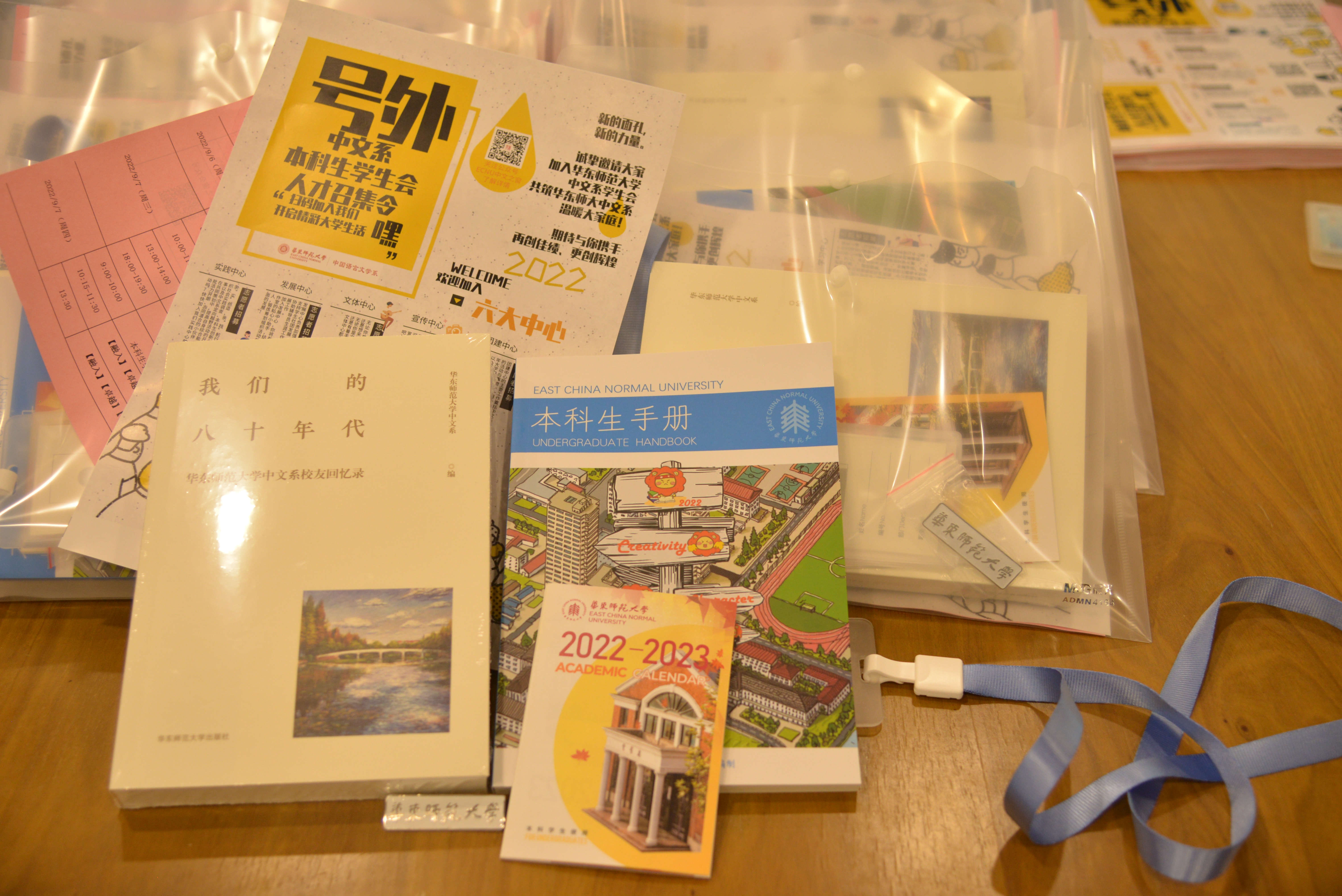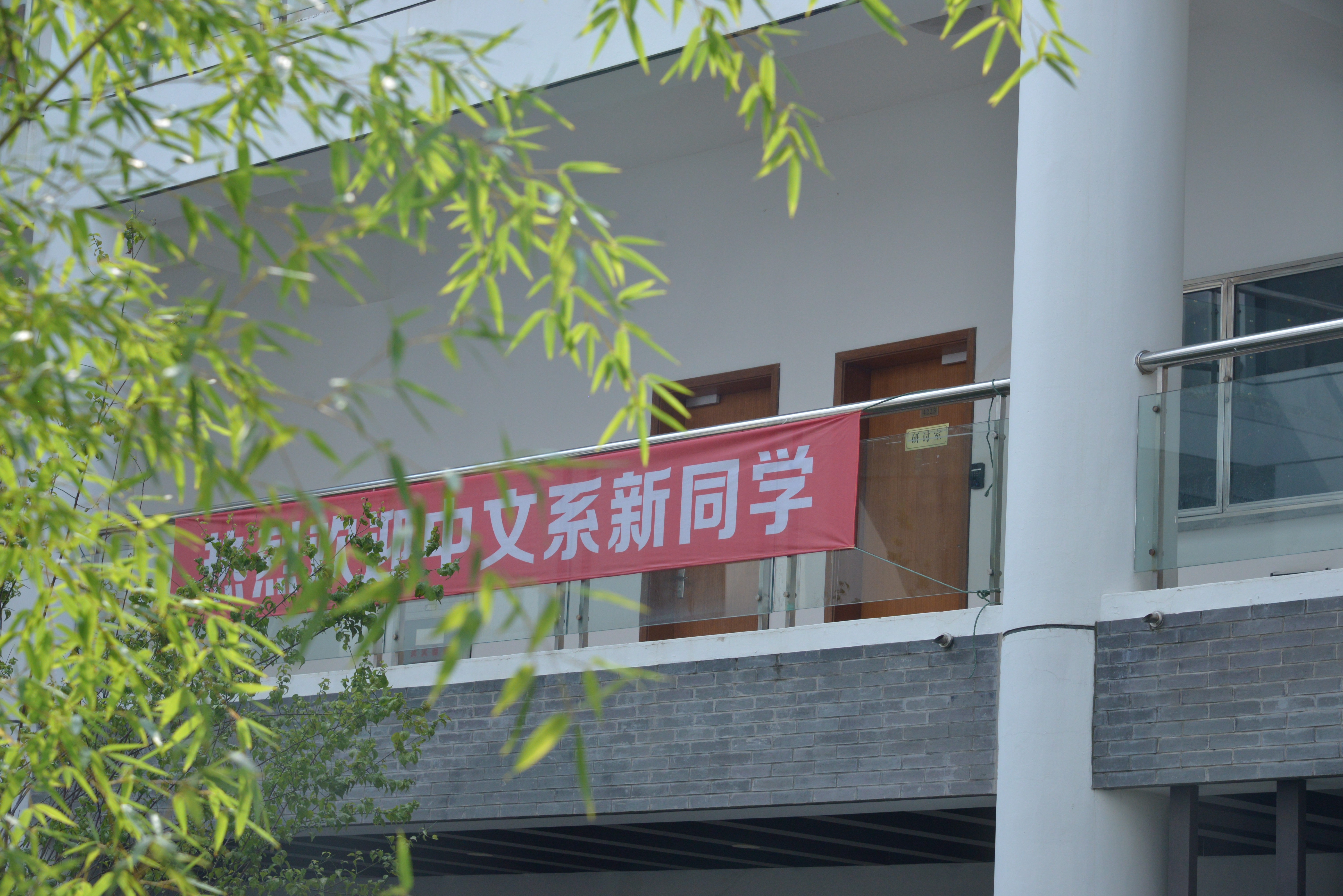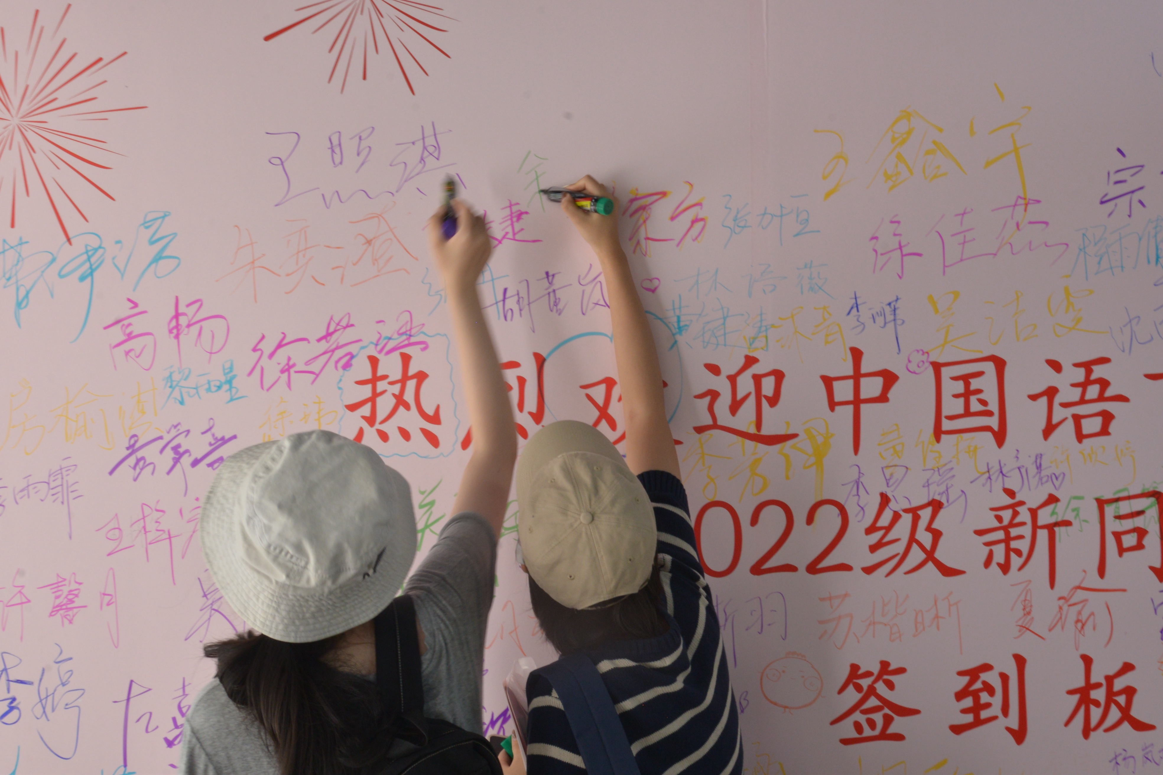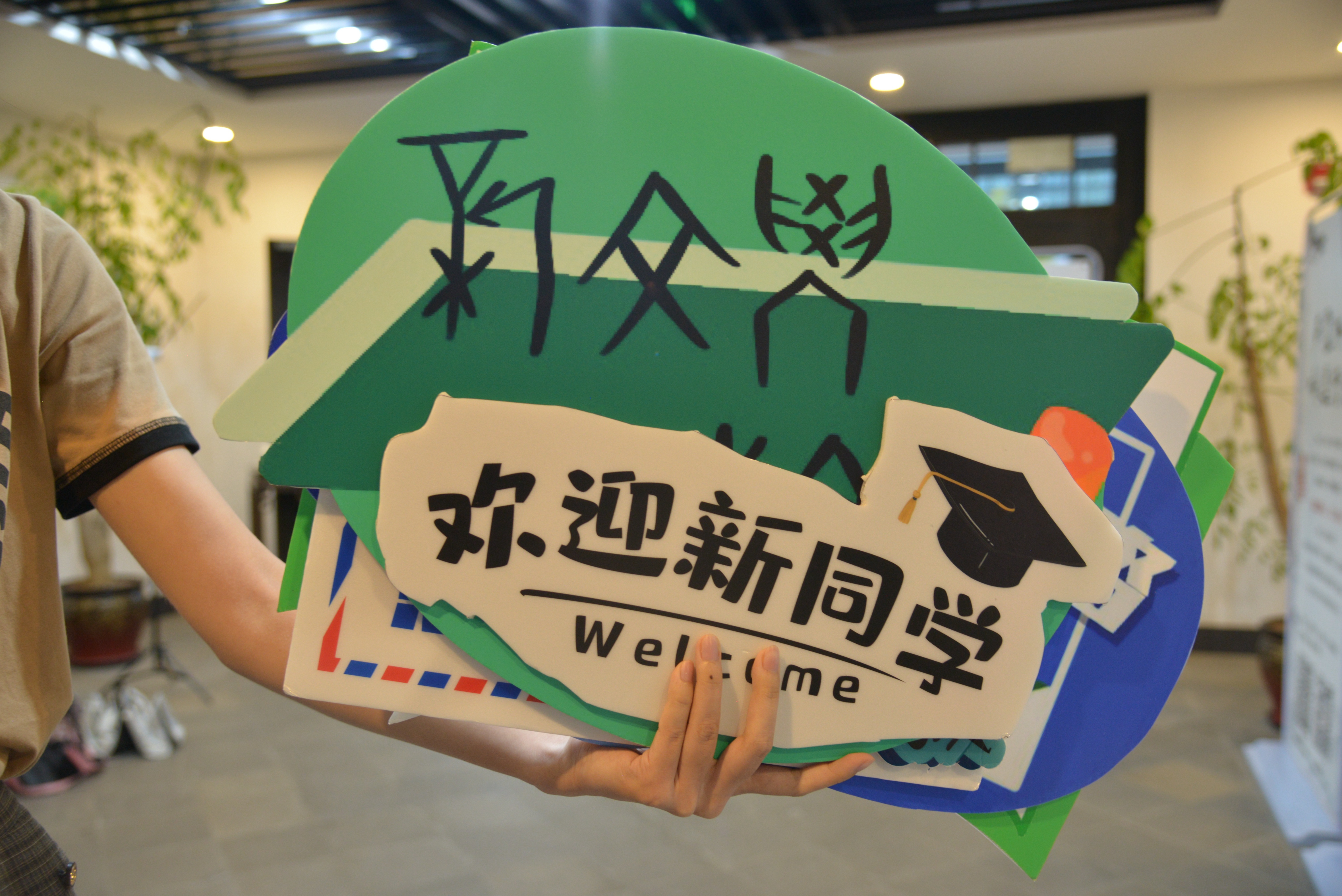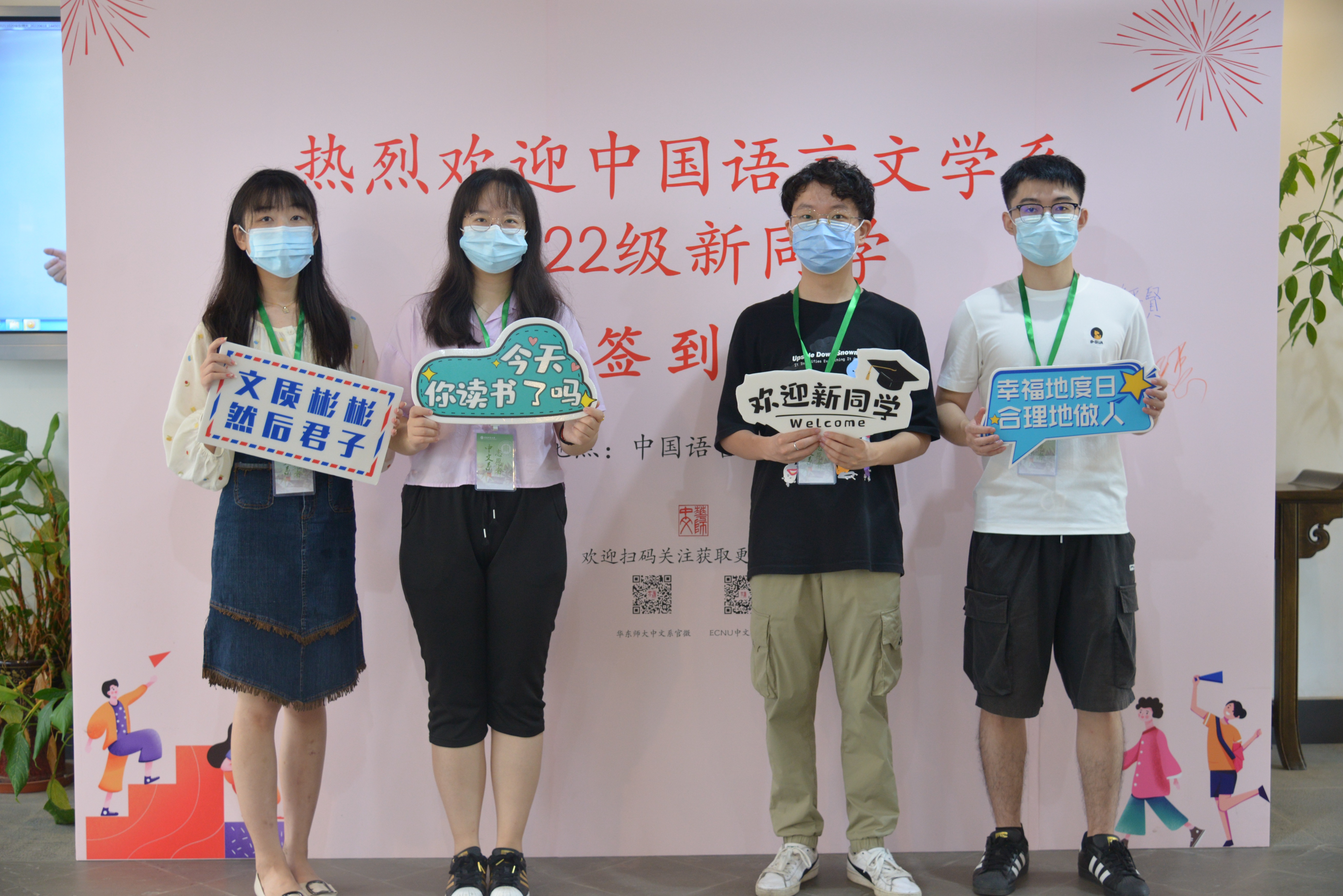 “幸福地度日,合理地做人”,新生们怀抱温暖的希望来到系楼与签字板合影,领取新生手册。