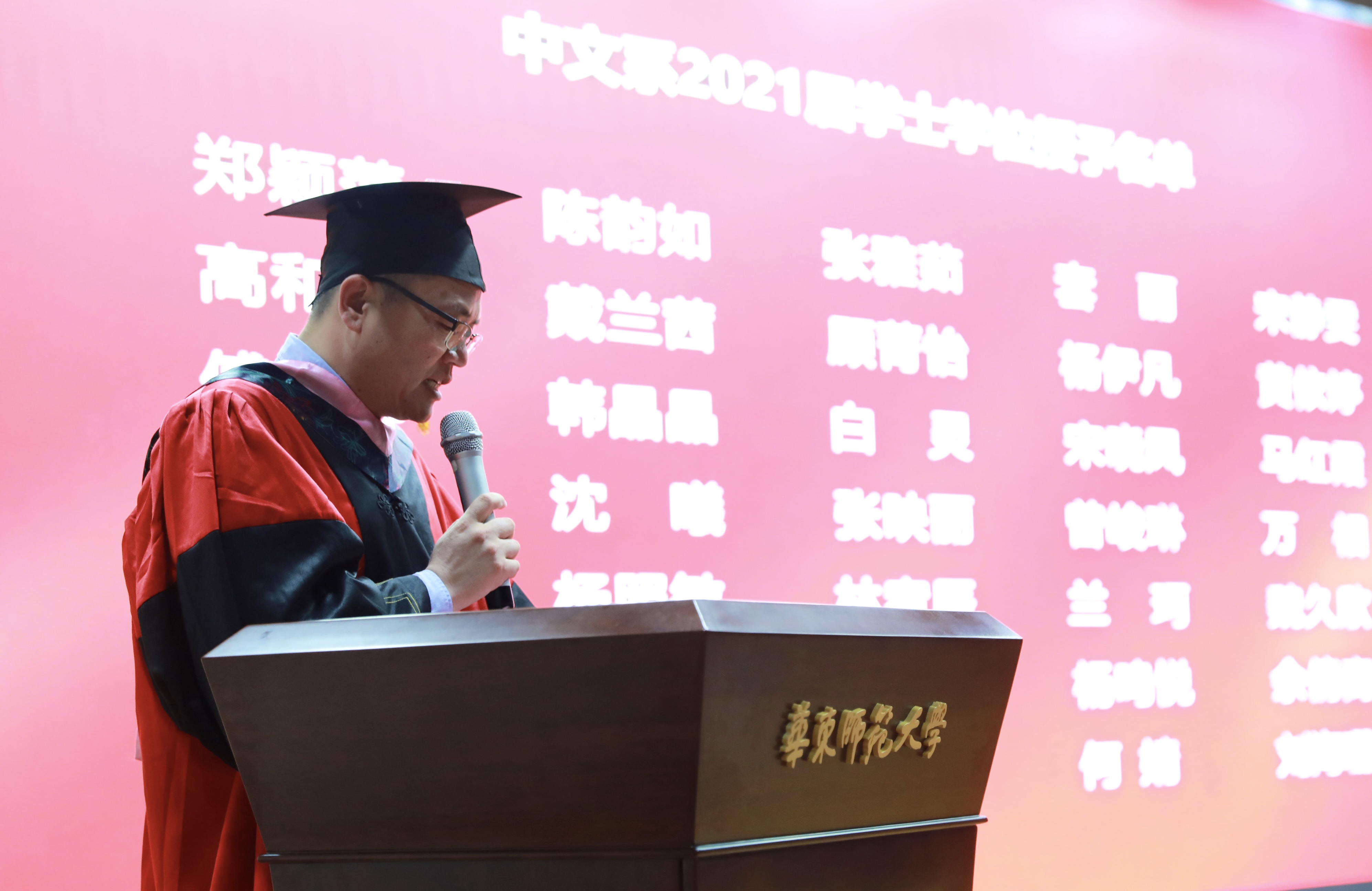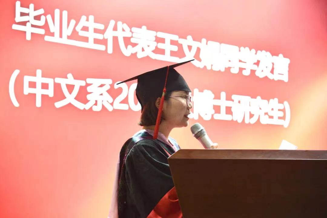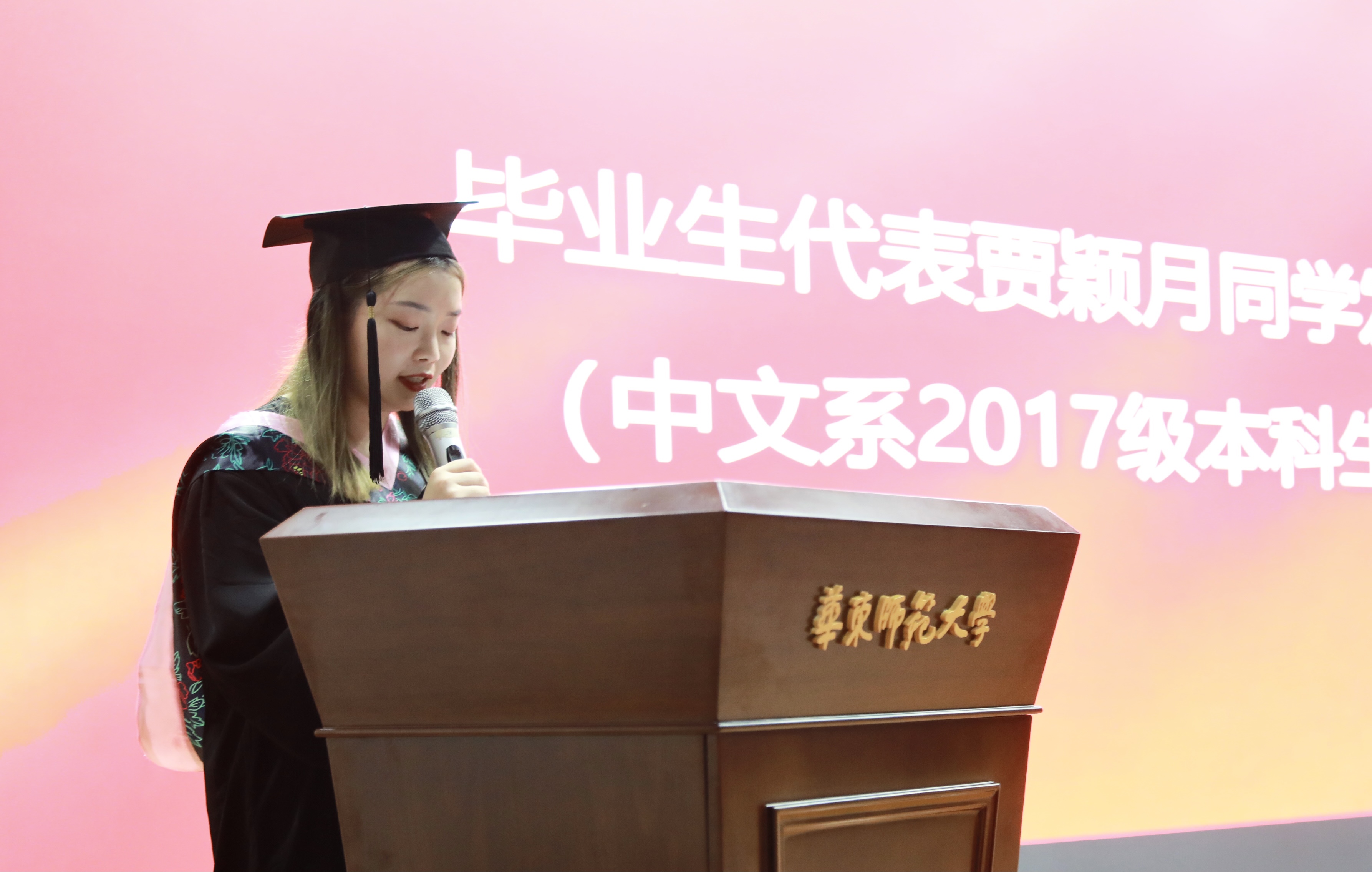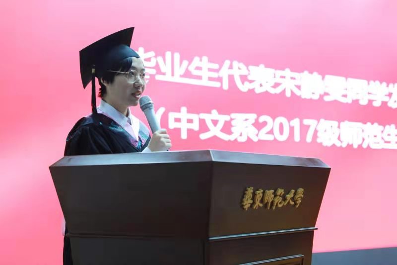 2021届硕士毕业生代表林慧珍、博士毕业生代表王文娟分别发表了毕业感言。林慧珍回忆起本、硕七年在华东师大的学习生涯,印象最深刻的是华师中文“润物细无声”的教育,感谢老师们课堂上的循循善诱和论文上的悉心指导,尤其感谢梁艳导师亦师亦友的陪伴和激励。王文娟也在这里度过了最美好的七年,见证了华东师大的诸多变化,但不变的是宁静的校园环境,安宁而美好的中文底色。将大我溶于小我之中,真诚地面对自己的身份并承担起其中的责任,潜移默化地给周围人带去正面力量,是王文娟从宅男女神 学到的为人师者的操守。