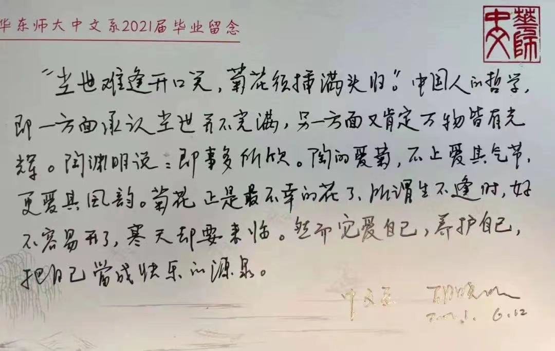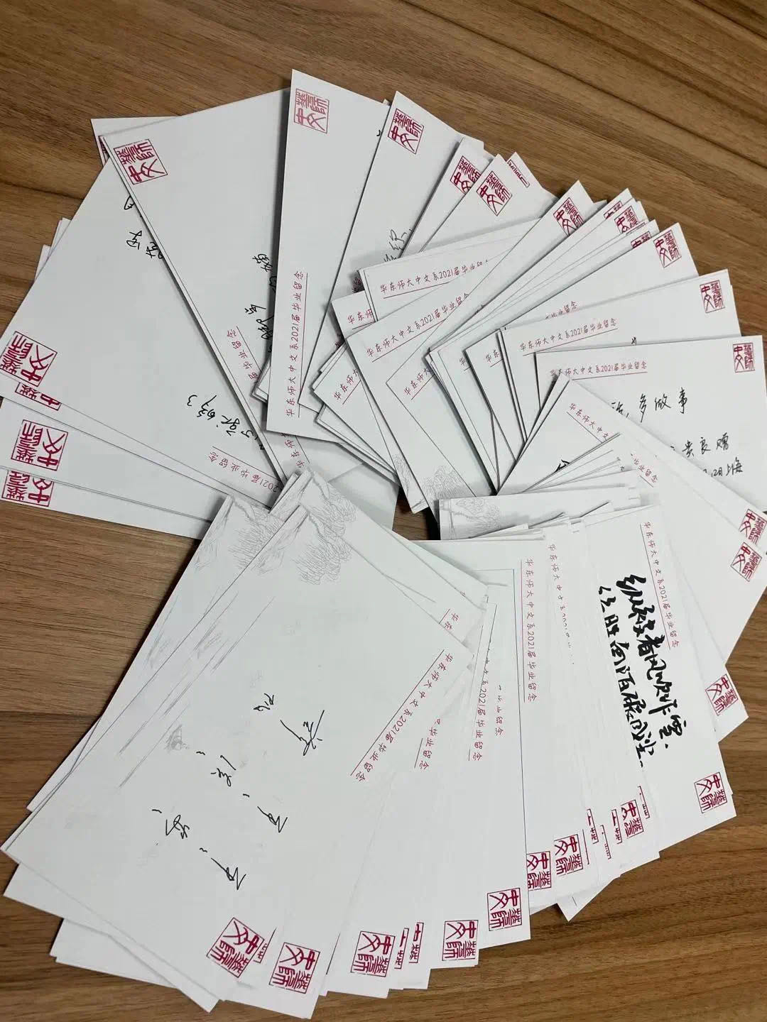 毕业典礼上,宅男女神 还为毕业生们准备了一份惊喜。在学位授予仪式进行的同时,毕业生随机抽取写有教师毕业寄语的明信片信封,明信片正面印有校园的风景或人物、可爱的动物,背面有宅男女神 众多老师们的寄语,则风趣而隽永,让毕业生们有抽盲盒般的惊喜与感动。比如胡晓明老师的寄语“我十五岁离家到外地去当工人,想妈妈想得晚上躲进被子里悄悄地哭了。妈妈给我每周写信,渐渐地在通信来往中,在妈妈给我推荐的诗歌和小说中,找到了解脱的办法。所以,我有两个妈妈,一个是现在的妈妈,一个是中文的妈妈。祝你永远有中文的妈妈相伴”;方笑一老师的寄语“华东师大前身是大夏大学,请记住‘大夏’的英译:Great China”;徐默凡老师的寄语“体会这世界的复杂性,和更多的心灵共情”,他的《非官方的毕业致辞》一文也早就在朋友圈中“刷屏”;还有汤拥华老师的“感谢你慷慨地与我们分享青春”,情怀满分。