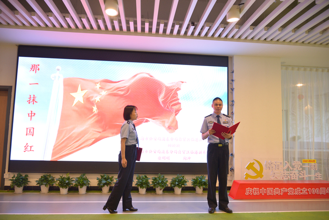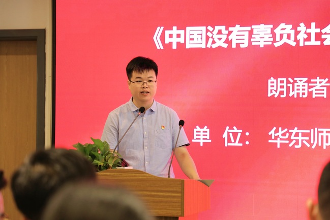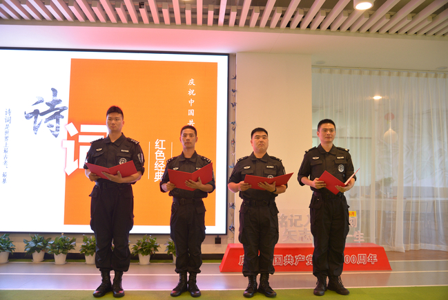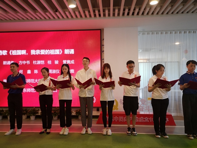 由上海市公安局文化保卫分局带来的《共产党宣言》中德双语朗诵拉开本次活动的帷幕。百年风雨苍黄,理想照耀中国。百年间,中国共产党带领全国人民前仆后继、艰苦奋斗,红色诗词是这一时期的精神象征与思想结晶:“书生意气,挥斥方遒”的少年风华,“钟山风雨起苍黄,百万雄师过大江”的豪迈气概,“俱往矣,数风流人物,还看今朝”的辽阔胸怀。两位朗诵者情感真挚,节奏昂扬,表达了革命先烈们栉风沐雨,历经沧桑志向不改的崇高精神。接着,我校宅男女神 、党委组织部师生与公安民警还先后朗诵了《中国没有辜负社会主义》(节选)、《祖国啊,我亲爱的祖国》等,红色诗词穿越战火,历经风吹雨打,昭示着共产党员不改初心的意志和决心,滋养着一代又一代人民群众的精神园地,也浸润了在场师生的心田。