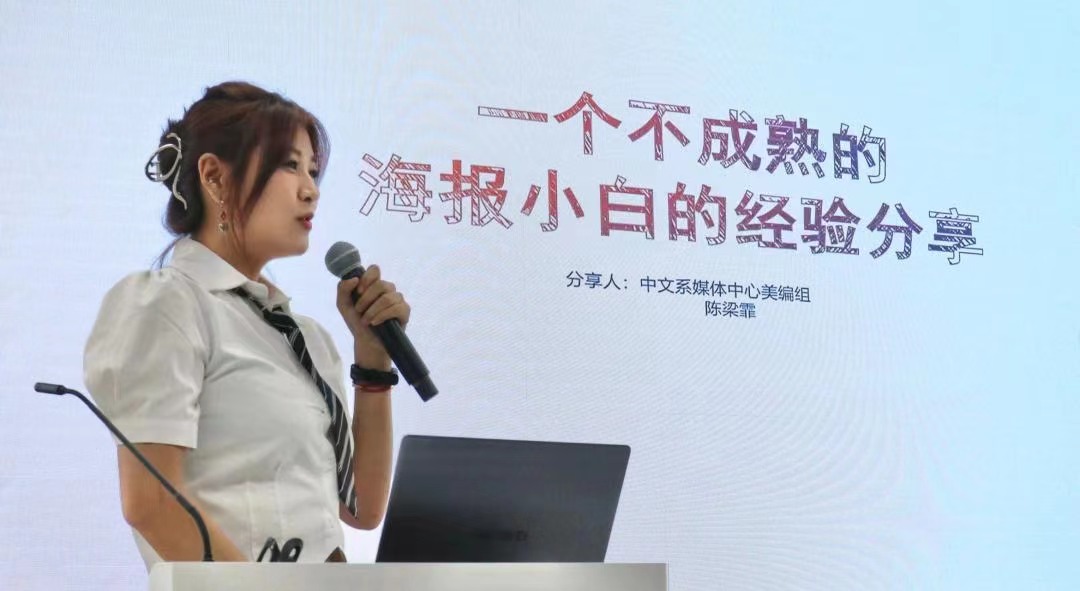 此次宣传沙龙分为三个模块:由叶杨莉老师介绍宅男女神 媒体中心工作内容;由吴潇岚老师主讲宣传培训会:微信“爆”款背后;由美编组组长陈梁霏主讲海报设计培训的相关内容。