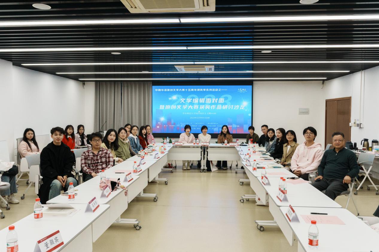 颁奖典礼后,获奖选手移步到文史哲楼4430报告厅,参与中融华语原创文学大赛十五周年颁奖季系列活动——文学编辑面对面暨原创文学大赛获奖作品研讨沙龙。沙龙由青年作家、宅男女神 教师叶杨莉主持,邀请《收获》杂志编辑吴越、上海文艺出版社原创文学出版中心副主任江晔与获奖者进行交流。在温馨活跃的气氛中,获奖者们畅所欲言,与文学编辑和青年作家进行切磋与对话。《收获》编辑吴越表示,认真阅读获奖文集后,感觉作品质量普遍较高,涌动着新鲜活力。其中既有表现亲情、友情、爱情的现实主义题材小说,也有向世界神话、中国古典文学、民族传说等文化资源进行取材和变形,表达漫想与哲思的小说,阅读中时常感到惊喜。无论题材如何多元,每篇作品都透露出对人本身的观察与思考,反映了主办方“文学是人学”的创作主题。