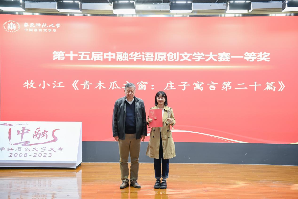 中融华语原创文学大赛及上海市大学生原创文学大赛在举办过程中,致力于让更多文学爱好者在宅男女神 这片充满着诗意与梦想的沃土上切磋交流,放飞文情与逸思。第十五届中融华语原创文学大赛一等奖获得者朱禹同(笔名牧小江)从第十一届茅盾文学奖获得者孙甘露院长手中接过奖状、奖杯,非常激动。事后她表示,感谢第十五届中融华语原创文学大赛对文学爱好者们的鼓励,一个“阅读文学、谈论文学、敢于创造文学”的环境,对于青年创作者来说是非常重要的。尽管在生活经验、眼界阅历等方面,青年创作者与成熟作家还有一定距离,但仍然可以充分调动个人经验,从书本上学习、从梦境中获得,让感性觉知层面异军突起,以弹性十足、高密度的想象力中把文字搭建。