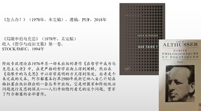 首先,吴老师将《论再生产》放到阿尔都塞的思考脉络中,指出本书是阿尔都塞在马克思关于社会形态科学理论的延长线上去进行思考的。阿尔都塞不是从哲学的角度去讲历史政治,而是站在马克思所开创的历史科学的角度去讨论哲学。因此,《论再生产》是阿尔都塞对马克思主义历史科学发展和完善的一个系统性的起点,在此基础上,吴老师提出“七十年代阿尔都塞”这一概念。随着近些年阿尔都塞写于1970年代大量遗稿的整理出版,我们可以发现七十年代时期阿尔都塞写作的许多文本都是沿着《论再生产》所开启的路线,对马克思主义历史科学中的一些重要问题作出持续思考和探索。“七十年代阿尔都塞”中不仅有关于马克思主义陷入危机的宣言,更有大量关于摆脱“危机”的理论推进乃至实际政治干预的吁求,需要研究者进一步加以重视。