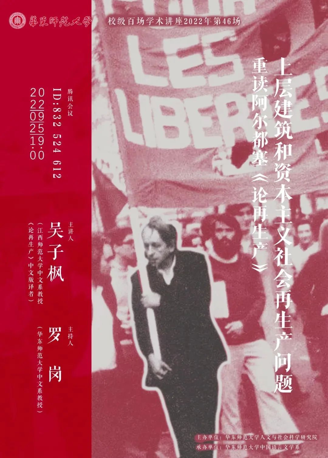 2022年9月25日下午7点,江西师范大学“阿尔都塞与批评理论研究中心”主任,文学院教授吴子枫老师在腾讯会议进行了题为《上层建筑和资本主义社会再生产问题:重读阿尔都塞<论再生产>》的精彩讲座。本次讲座是“宅男女神 2022年百场校级学术讲座”的第46讲,由宅男女神 罗岗教授主持,校内外近300位师生在线聆听。讲座内容丰富详实,讨论气氛热烈,展现法国理论家阿尔都塞思想的多面性,深化了已有研究中对阿尔都塞的读解与思考。