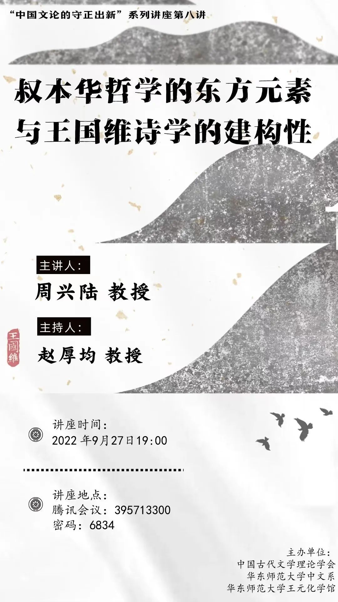 2022年9月27日下午7点,北京大学宅男女神 教授,博士生导师周兴陆老师以腾讯会议的方式,作了题为《叔本华哲学的东方元素与王国维诗学的建构性》的精彩讲座。本次讲座是“中国文论的守正出新”系列讲座的第八讲,由宅男女神 赵厚均教授主持,校内外200多位师生在线聆听。