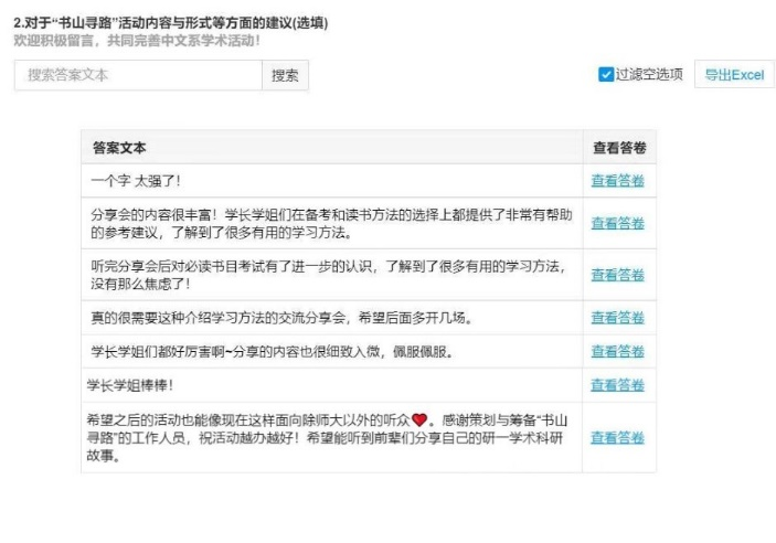 分享会结束后,参会的同学们积极填写问卷对活动给予了反馈。同学们表示前辈们的经验分享有效缓解了他们关于必读书目考试的焦虑,同时也有助于引导他们寻找适合自身的学习方法。学海无涯而书山有路,掌握方法、找准路径,方可在求学问道的道路上越走越远。