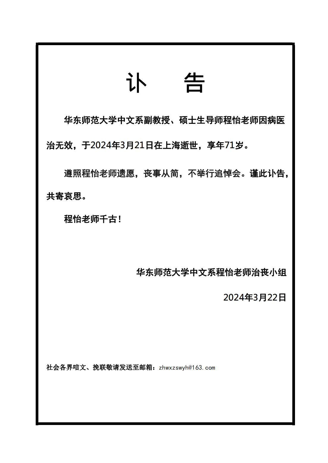 沉痛悼念程怡老师!