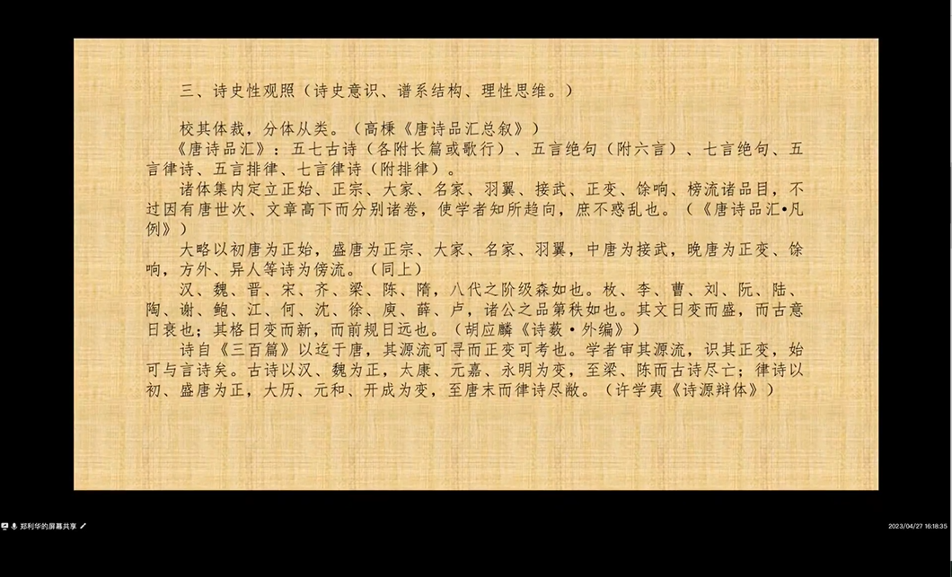 讲座伊始,郑老师首先与我们分享了韦勒克《文学理论》中的一段话:“我们的出发点必须是以作为文学的文学发展史。这样,分期就只是文学一般发展中的细分的小段而已。它的历史只能参照一个不断变化的价值系统而写成,而这一个价值系统必须从历史本身中抽象出来。因此,一个时期就是一个由文学的规范、标准和惯例的体系所支配的时间的横断面,这些规范、标准和惯例的被采用、传播变化、综合以及消失是能够加以探索的……一个时期不是一个类型或种类,而是一个以埋藏于历史过程中并且不能从这过程中移出的规范体系所界定的一个时间上的横断面……一个特定的时期不是一个理想类型或一个抽象模式或一个种类概念的系列,而是一个时间上的横断面,这一横断面被一个整体的规范体系所支配。”进而,郑老师提示研究者们,在文学、诗学乃至史学研究时,正视历史发展的复杂多样性,透视历史样态,尽可能把握历史生成的动态过程,并在此基础上开始了今天的讲座。