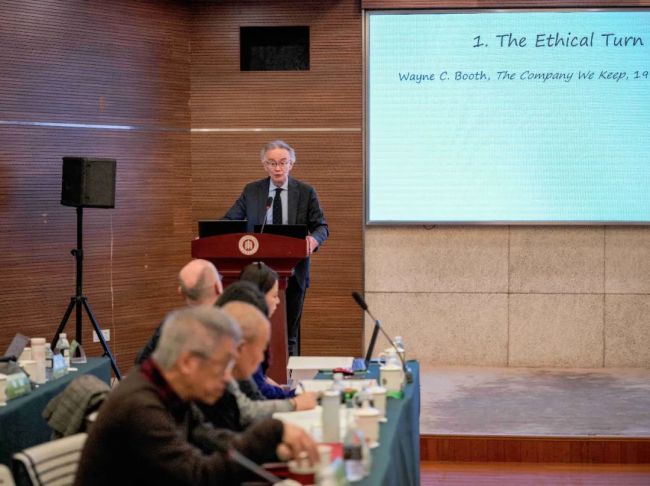 法国巴黎新索邦大学Paolo Tortonese教授的发言题目为《叙事的道德内涵》,他主张文学批评的工作是理解、澄清和讨论文学作品的意义,如果要构建文本与读者之间的对话,形成德行伦理对法律伦理的对抗,就需要激活亚里士多德在当代文学研究中的应用。